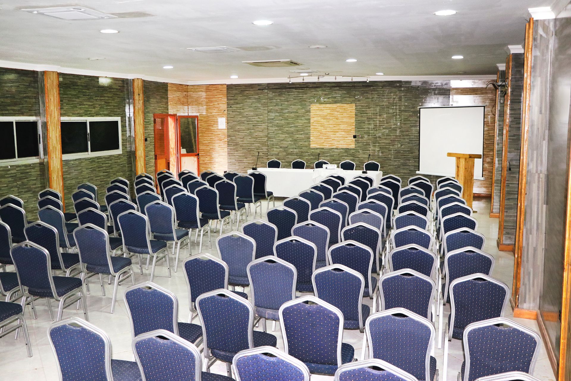 Grande salle de 150 m2, capacité 200 pax en forme théâtrale, 120 pax en forme U et V, climatisation, wifi, data-show, écran de projection, flip chart, podium, sonorisation, et matériels de traduction simultanés au besoin.